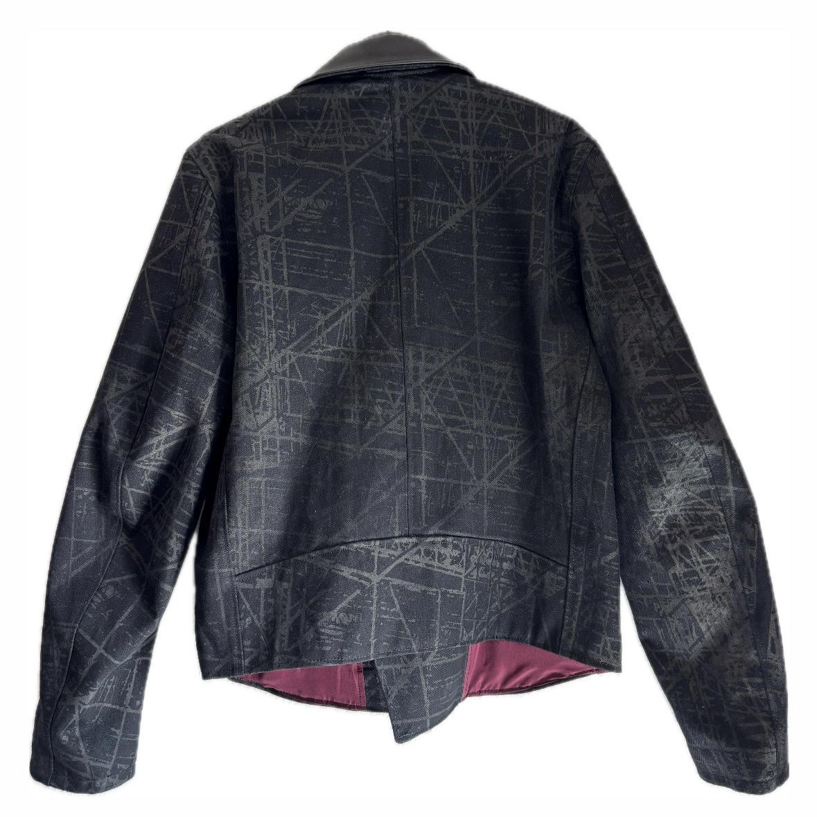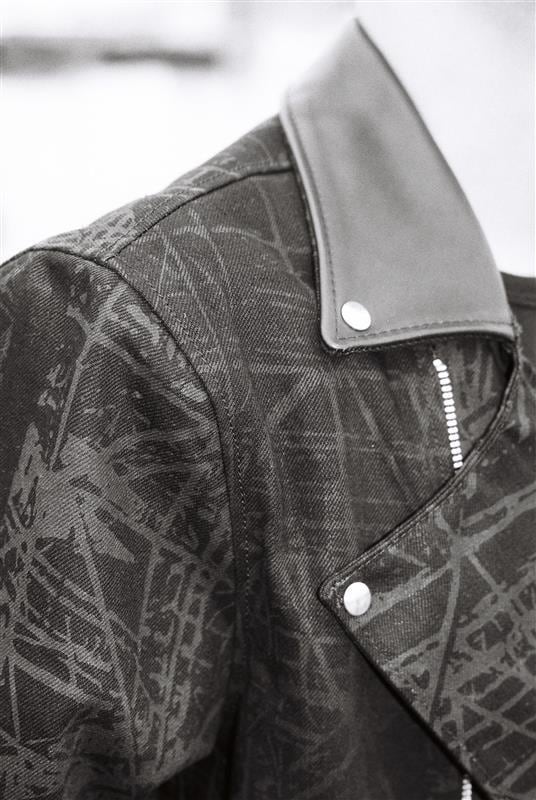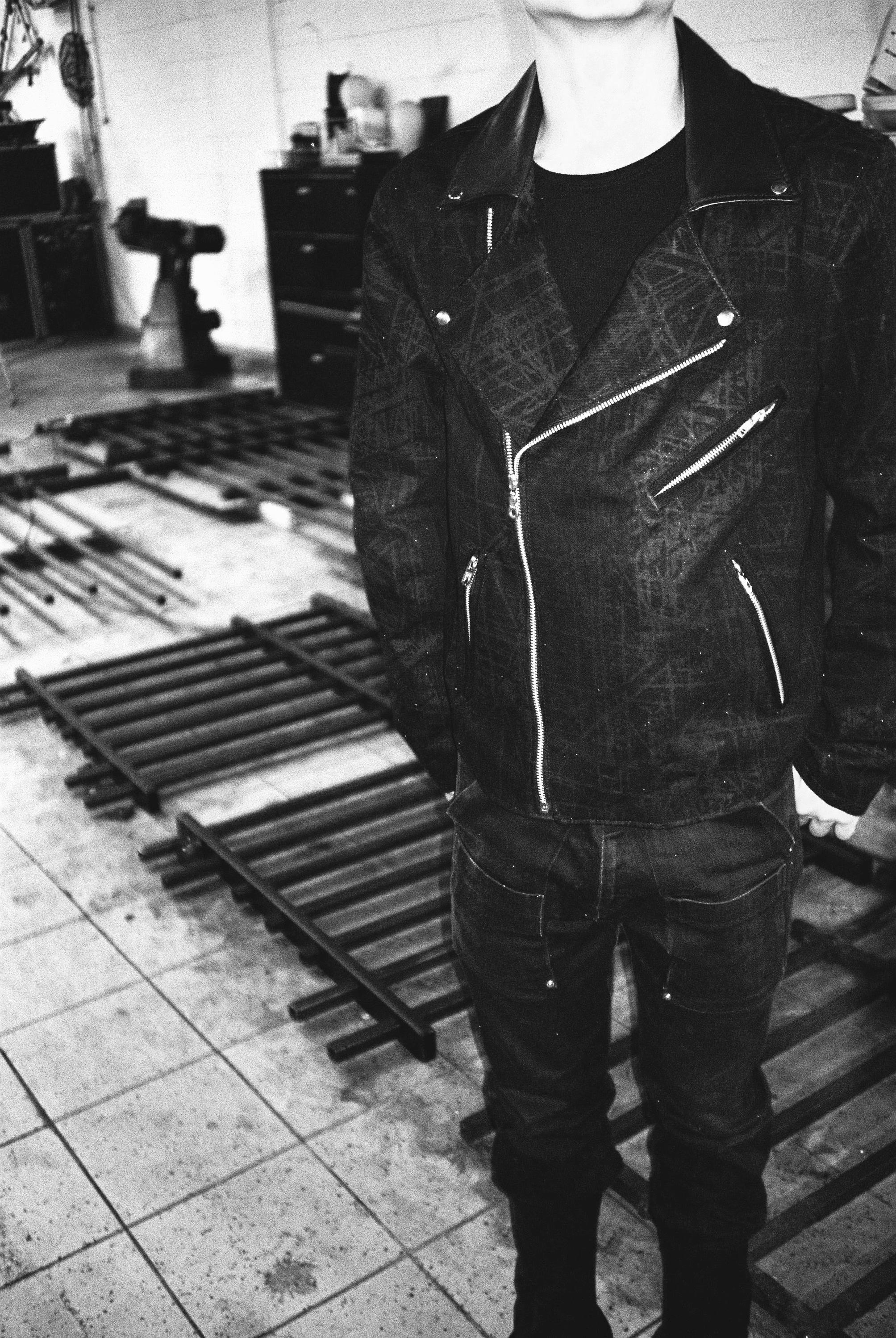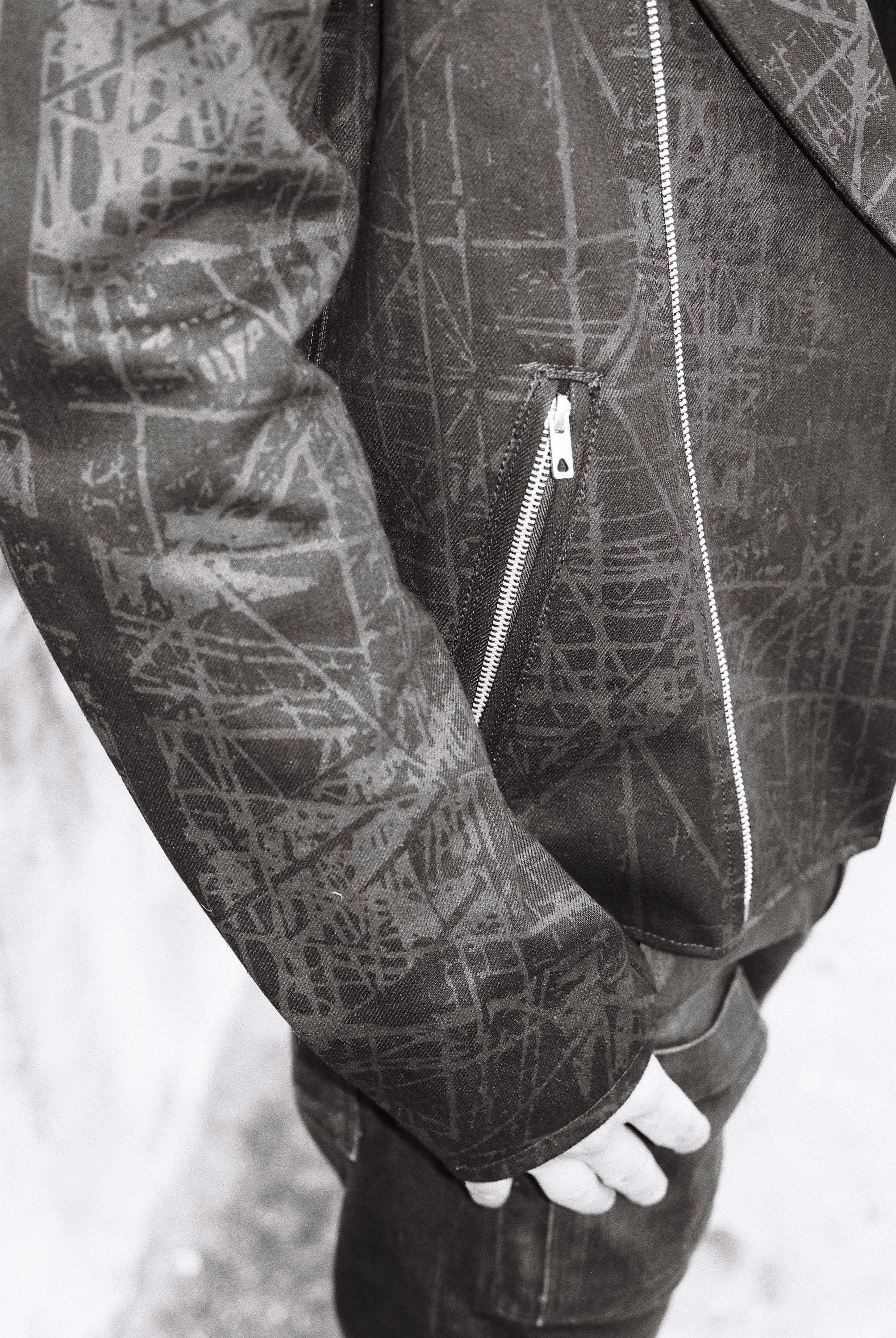 Neubauten Jacketmade from a 15oz Japanese Black Selvedge Denim that was screen printed inhouse with a black on black scaffolding all over printRed cotton lining with Wild at Heart patchGenuine leather collar