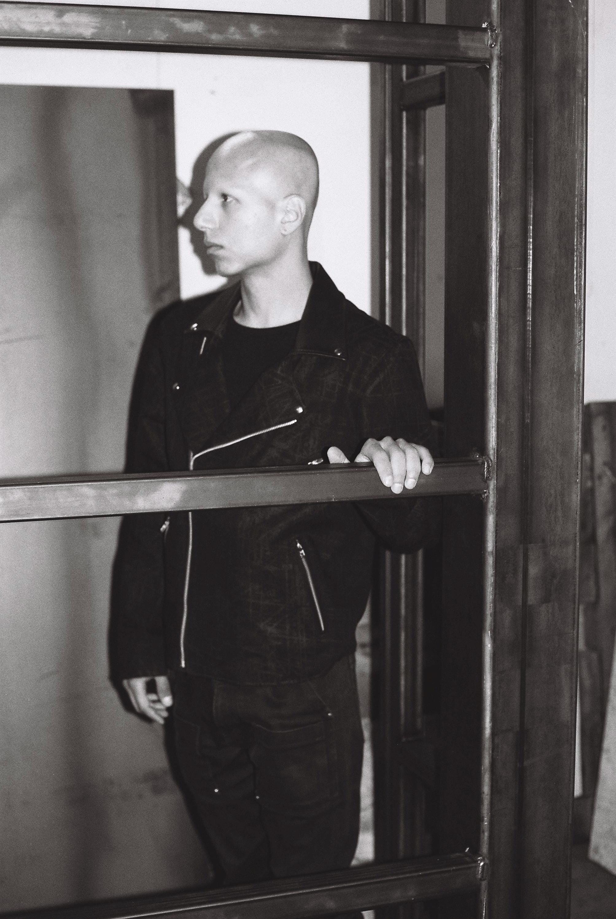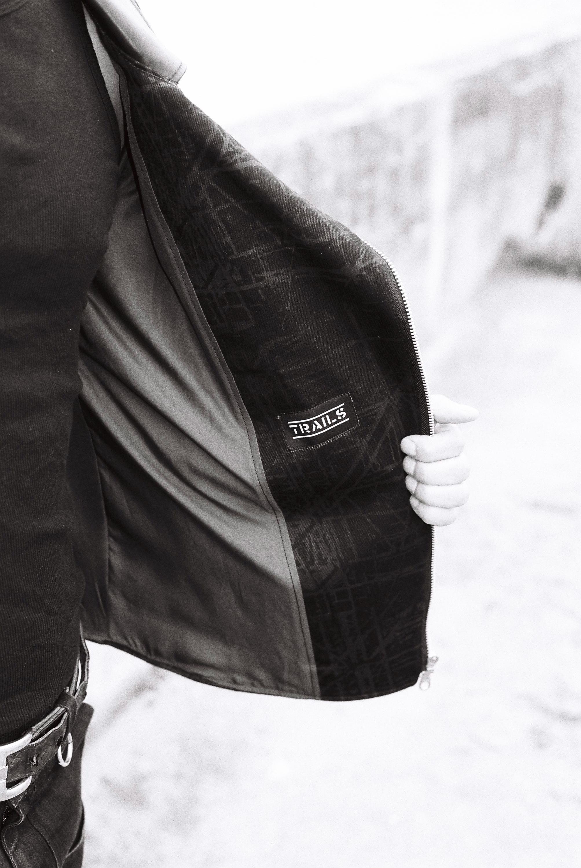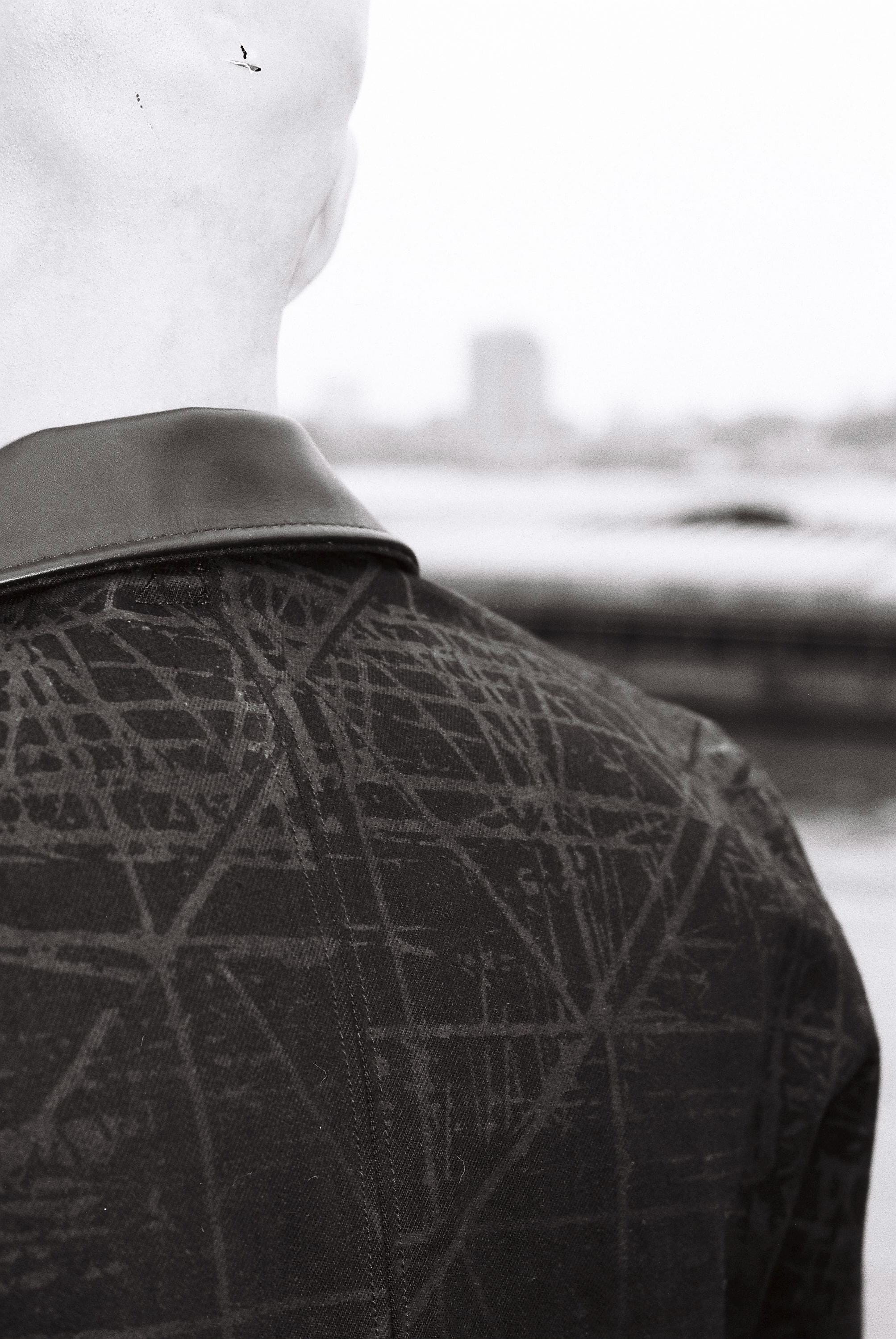 Neubauten Jacketmade from a 15oz Japanese Black Selvedge Denim that was screen printed inhouse with a black on black scaffolding all over printRed cotton lining with Wild at Heart patchGenuine leather collar